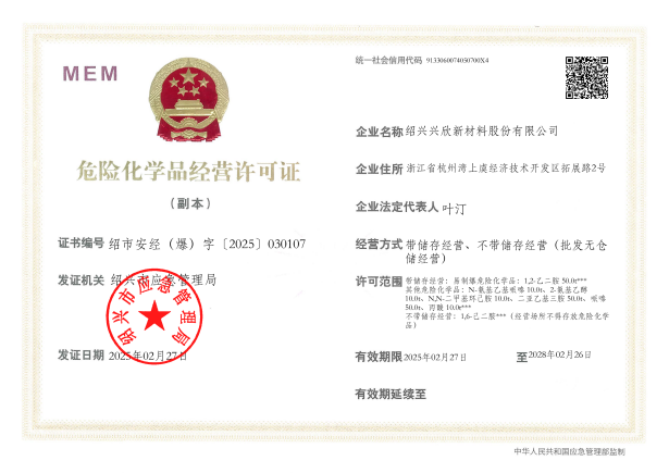 紹興興欣新材料股份有限公司成立于2002年06月27日,占地面積122畝,位于杭州灣上虞經濟技術開發(fā)區(qū)拓展路2號,現(xiàn)有職工200余人,專業(yè)技術人員50余人;博士、碩士研究生30余人組成的一支知識型、專業(yè)化的技術科研團隊。公司面向全球市場,專業(yè)開發(fā)電子化學品、環(huán)保化學品、醫(yī)藥中間體、高分子材料等先進新材料重點領域的省級科技型企業(yè);建有浙江上虞、安徽東至兩個生產基地。目前為“國家高新技術企業(yè)”、浙江省“隱形冠軍”企業(yè)、浙江省專精特新中小企業(yè);建有“省級”研究開發(fā)中心,共建天津大學浙江紹興研究院電子化學品研發(fā)中心。